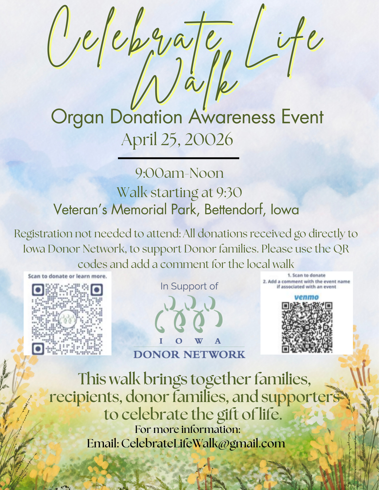 A third-party event that recognizes organ donors and their families, while honoring the lives impacted by organ donation, and raising awareness about the power of organ and tissue donation. All funds raised from the event will be donated to Iowa Donor Network to support their mission.