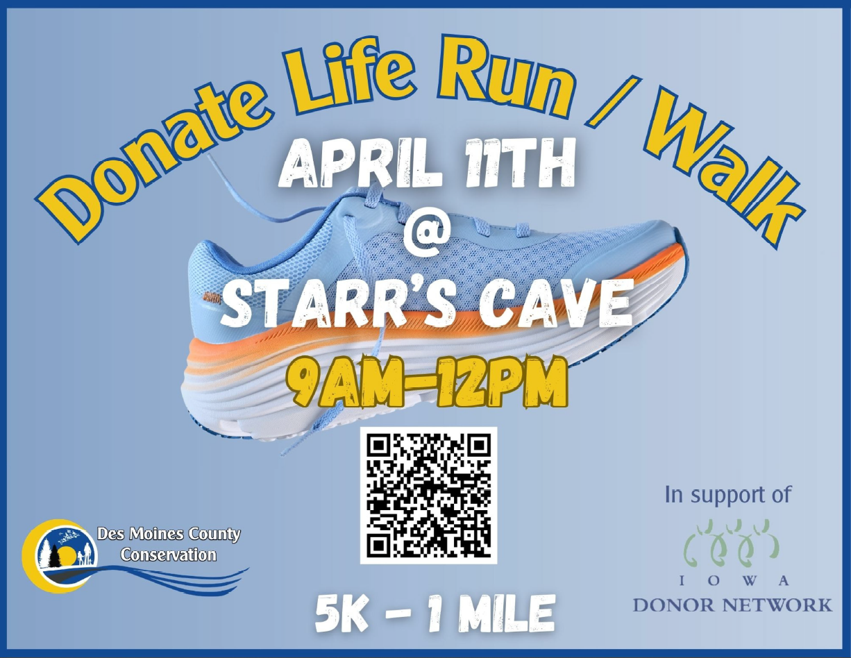April is Donate Life Month, and we invite YOU to join us for the Donate Life Run on Saturday, April 11, in support of the Iowa Donor Network and Des Moines County Conservation!